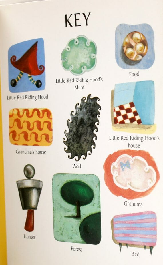 At the opening of each one, the tale is told briefly in words, with a page of symbols beside it that represent the key places, people and objects from the story. Then the wordless pages begin, and the reader needs to decode the symbols shown on each picture to make sense of what is happening.
