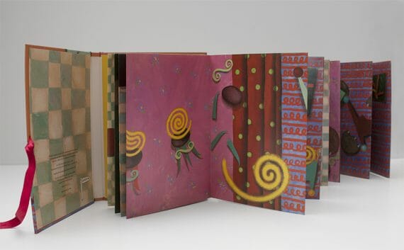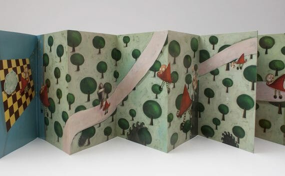 Tell Me What You See is a picturebook in the shape of a long accordian-fold piece of card. It relates two familiar fairy tales – ‘Goldilocks’ and ‘Little Red Riding Hood’ – in two sequences of virtually abstract images.