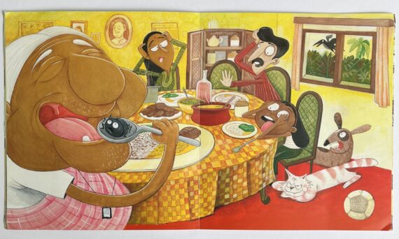 All the family, including the animals, are horrified by the grandmother’s antics. Their faces and body language depict their dismay, with Mum going boss-eyed, Dad putting his hand out to stop Ammachi eating the spider and the little girl covering her eyes. The dog also looks aghast. But it is the cat’s expression that is especially comical, infused with a malevolent pleasure that Ammachi, after treating her so ignominiously, is getting her just deserts.
