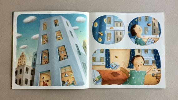 Jay creates her pictures in alkyd oil paints and they are very beautiful, with delicate and detailed portrayals of both cityscape and countryside. It’s worth looking closely at each image as there’s always much of interest to spot. For instance if you look carefully at the exteriors of the shop buildings you can guess what they might sell. (This is reminiscent of Mitsumasa Anno’s work in his ‘Journey’ series.) Or you could discuss all the different things that fly in the air, from airplanes and helicopters to butterflies and Canada geese. Or you could just observe the weather and the changing seasons in the pictures.