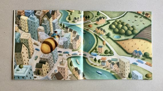 Together the bee and the little girl leave the city and fly out over the wild meadows of the countryside to collect a bag full of seeds. On the way home they scatter the seeds over the city and later plant some more in the girl’s window box.