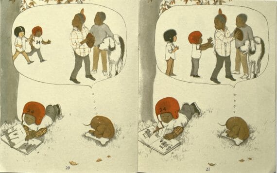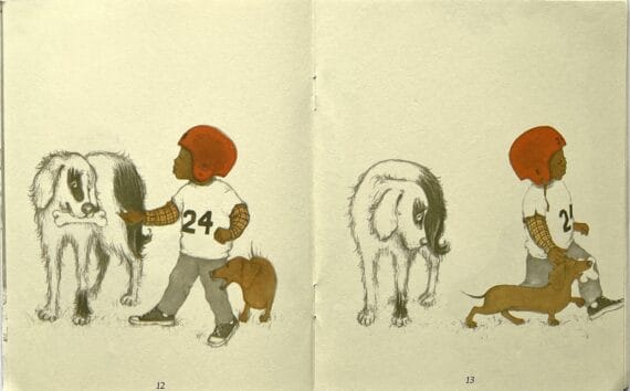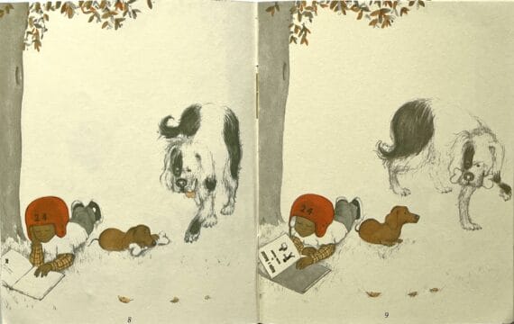 In defence of his companion, the boy chases after the big dog and retrieves Bobo’s bone, and in return Bobo gives the boy a grateful lick. They return to their spot under the tree and Bobo drops off to sleep, dreaming of his boy going to play ball with friends.