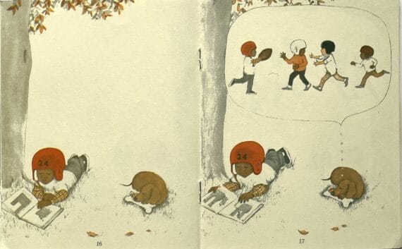 The friends are lying side-by-side in companionable silence, relaxing under a tree in the park, while Bobo gnaws his bone and the boy reads his picturebook. (Incidentally, the book he is reading is Maybe a Monster, another title by Martha Alexander; Charles Keeping made a similar visual joke in his wordless book Inter-City.)