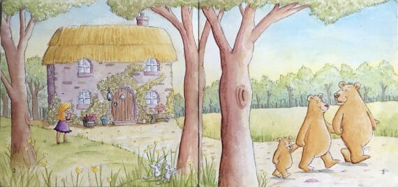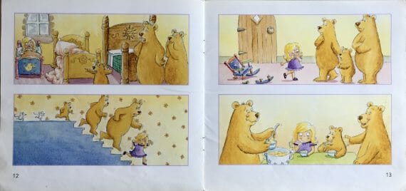 At the back of the book is a ‘story map’, which can be used as a prompt to help children retell the tale in their own words. One interesting aspect of this map is that, as well as showing the interior of the cottage, the Bears’ journey through the forest is also illustrated. This allows children the freedom to tell a separate tale of the Bears’ walk and what they got up to during it, such as picking apples, eating honey, going fishing, and walking over a bridge.