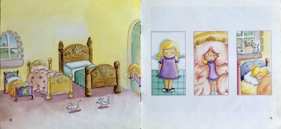 The book comes early in the Collins Big Cat guided reading series and is designed to develop an understanding of how stories work. So the soft pastel pictures, shown in a mix of spreads and panels, are very clear and easy to follow. The look of the book is quite ‘cutesy’, with a wide-eyed, pink-cheeked Goldilocks and a chocolate-box thatched cottage shown in the middle of a flower-strewn wood. But a nice little addition to the story are the two naughty mice who accompany Goldilocks everywhere and generally add their own pennyworth to the overall chaos.