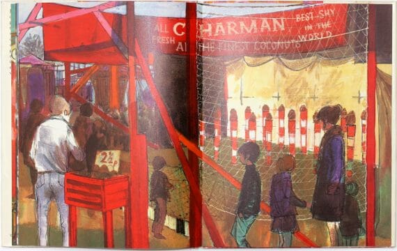 Opening and closing sentences bookmark this wordless picturebook: ‘Joe comes to the fair’ and ‘Joe goes home’. In between are spreads of typical fairground activities of the time.