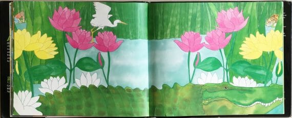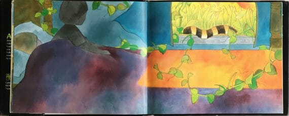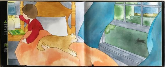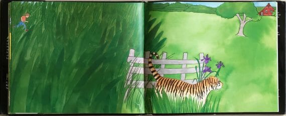 The illustrations, in watercolour, coloured pencils and black line, are bright and mostly realistic. Within each picture can be seen both the cat/tiger and the boy, with the latter often shown quite small, peeping out from behind some leaves to observe the animals – much as we are observing them in the pictures. The image in which the story switches from reality to dreamscape is particularly effective; the boy is represented as two children (one real, one a shadow), the cat’s tail gains some tigerish stripes and, creeping in through the window like the wisps of a dream, are long tendrils of jungle vines.