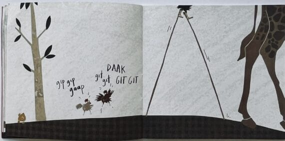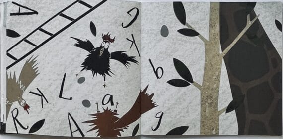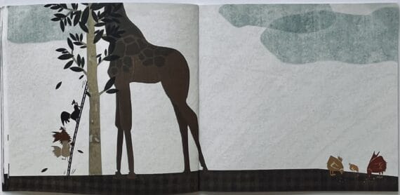 The birds’ peace is disturbed when a giant hoof appears on the far right of the page. Their curiosity is piqued and they are pretty alarmed. They have a quick chat and decide they need to investigate the intruder and introduce themselves to it. The black hen has the inspired idea of using some stilts to climb up to the animal’s head.
