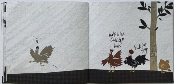 We find out on the next page, when we see a rather surreal image of three hens gathered around the upturned box at the base of the tree, engrossed in a game of chess.