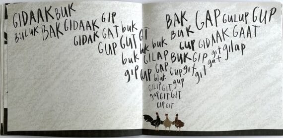 The expressions on the faces of the hens brilliantly capture their surprise, and the use of individual letters here is also interesting. Both upper and lower case letters tumble down the page like leaves from the tree, indicating a cacophony of disjointed bird-like squarks.