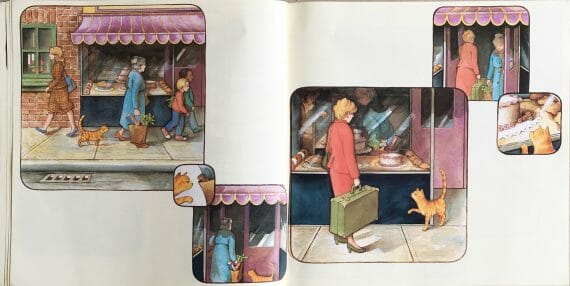 Schories’ illustrations are shown in curved-edge panels that alternate between wide-view images and close-ups. In the close-ups we usually see the mouse clearly, but in the wider views he is often tiny, or only visible because his nose or tail can be glimpsed peeping out of a bag or box.