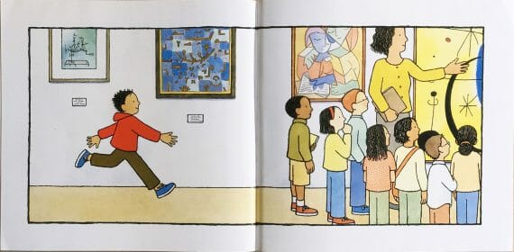 Lehman’s watercolour, gouache and ink illustrations tell this mysterious wordless story clearly and expressively, cleverly blurring the boundary between reality and imagination. Throughout the book it’s fun to spot works of art by famous artists, such as Vincent van Gogh, Henri Rousseau, Picasso and Alexander Calder. An added bonus is that a child looking at this book could also share the experience of solving the mazes, as they are each printed large enough to trace the route with a finger.
