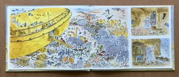 Noah’s Ark, though mainly wordless, is prefaced by a seventeenth century poem called ‘The Flood’ by Jacobus Revius (1586-1658). This poem was translated from the Dutch by Peter Spier himself. In 60 three-syllable lines, it tells the biblical story of Noah’s Ark.