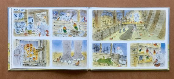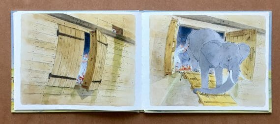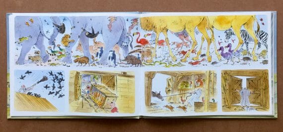 Plenty of humour is packed into each image. For instance Noah’s wife is so scared of the mice she has to jump up onto a basket, while Noah has trouble fending off the crows and yanking a reluctant donkey on board.