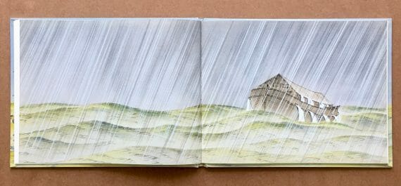 The pacing of the illustrations is varied, with the occasional large image filling a whole spread. This provides a refreshing ‘breathing space’ in-between the more complex panels on the other pages. These larger, often more simple, images can also help to emphasise the magnitude of the events being shown, such as the relentless rain teeming from the sky into the ocean.