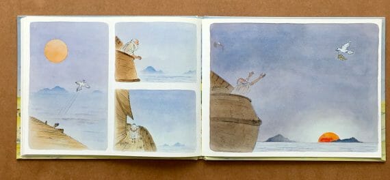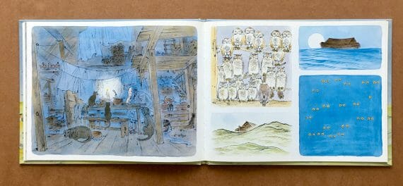 A sense of time passing is conveyed by the switches between day and night. In one image we see a tired Noah slumped at a candle-lit table, surrounded by animals, untidy stores and row upon row of wet washing. There is an overwhelming feeling of ennui and weariness. On the facing page we see the owls waking from their daytime sleep as the moon rises over the ark.
