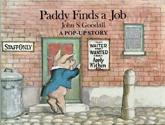 British illustrator John S. Goodall created many fiction and non-fiction wordless picturebooks in the second half of the 20th century. This title – a small novelty one with pop-up pages, flaps to lift and a tab to pull – is one in his popular Paddy Pork series of stories.