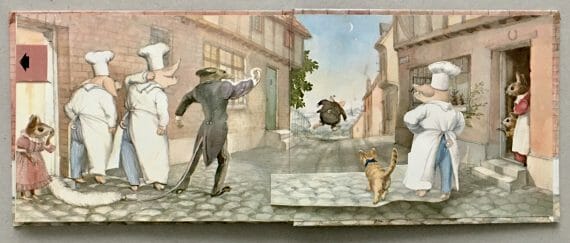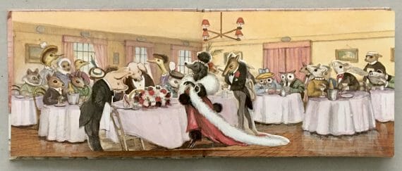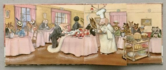 This visual story is told in delightful illustrations that feature many cute animals. As the diners watch the disastrous events unfold one lugubrious toad, who had previously been enjoying a quiet after-dinner drink and smoke, suddenly raises his hands in the air in shock and sends his cigar soaring across the room.