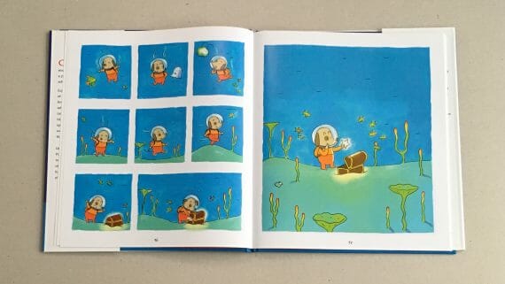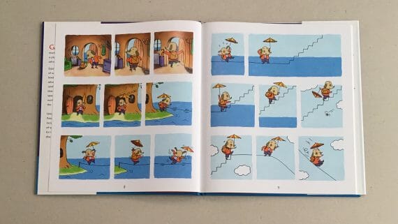 The story, which is told through a series of bright comic-book panels, has so many twists and turns that it takes a surprisingly long time to read. The illustrations are charming, and the narrative gap between each one is usually just enough for the reader figure out how Polo has magically got from one place to the next. A delightful book.