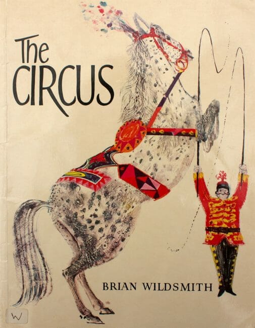 There is a strong focus on the animals of the circus in this book, many of which feature prominently in an image of opening parade, particularly the leading elephant. Wild animals would still have been a common component of British circuses at this time, and Wildsmith’s pictures include several exotic creatures. There are tigers and a lion roaring, brown bears riding bicycles, seals balancing balls on their noses and an elephant edging tentatively across a row of upright glass bottles. The animals’ facial expressions, in particular their eyes, are at best non-committal and at worst unhappy or angry. Wildsmith’s images, intentionally or not, reflect the emerging concern at the time about the welfare of these animals, and there is a subtle implication of the cruelty involved.