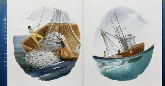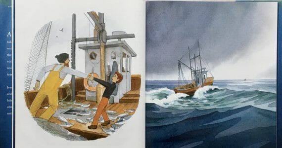 This wordless picture book tells the emotional story of a fisherman and his son who find a whale caught in fishing nets and set it free.