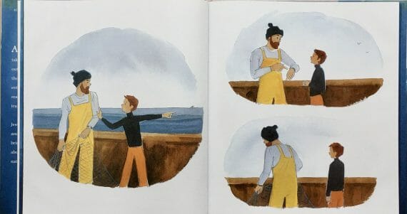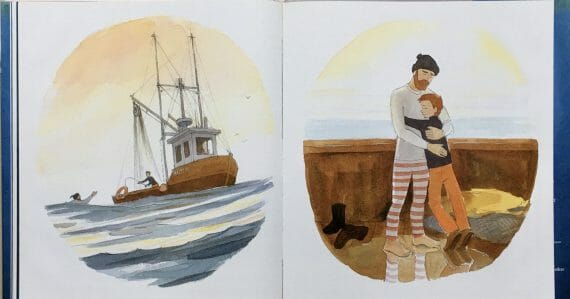 Not long after, the boy throws his father a lifebuoy and draws him back into the boat. Once back on board, the fisherman gives his son a big celebratory hug. Together they have released the whale – who makes one final appearance to ‘thank’ them.