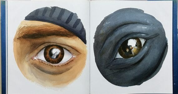 The emotional connection between these vastly different creatures is emphasised in a spread that shows close-ups of their eyes, one on the left and the other on the right. The first belongs to the fisherman, with the whale reflected deep in his iris. The second belongs to the whale, with the boy and his father reflected within.