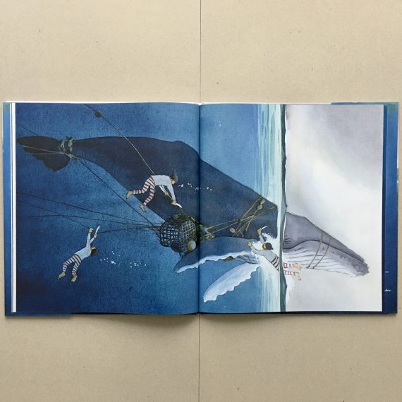 This title is the first Lanan has both written and illustrated. Her pictures, rendered in watercolour and gouache, use contrast cleverly to distinguish the two elements of the story: the realistic and the imagined. The fisherman, his son and their boat are shown in a straightforward representational style, while the whale and the ocean are depicted in a much more atmospheric, dynamic way. This helps to emphasises the poetic, fable-like nature of the book.