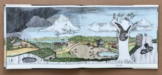 The wordless picture book Thunderstorm covers a period of just six hours. All the events take place during a single afternoon when a fierce storm suddenly overtakes an American farm and wreaks havoc.