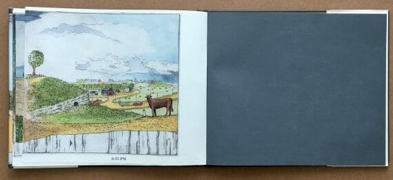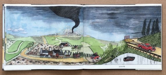 According to the book’s prelims, the illustrations ‘were produced from copperplate etchings that were first hand printed and then hand colored using watercolor paints’. The pictures are highly detailed and are absolutely packed with information about the course of a mid-western storm.