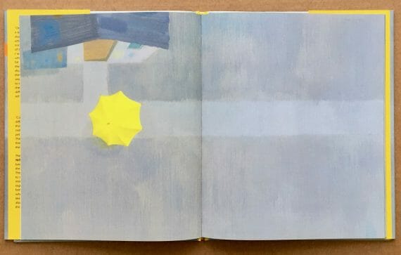 The opening image shows a rather grey landscape, suitable for a rainy day, with a house to the lefthand side and a path stretching across the page to the right. Leaping out from the drab background like a golden sun is a single vivid yellow umbrella – seen from above – apparently setting off along the path.