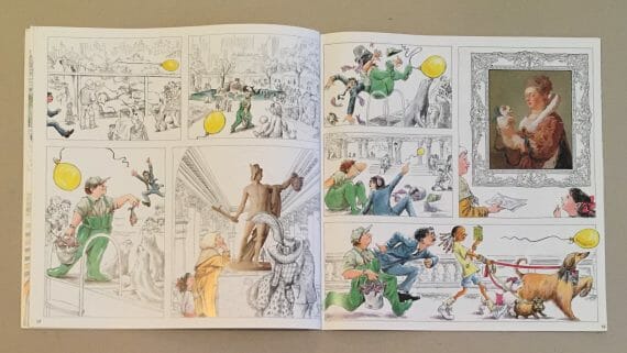 Spread from You Can’t Take A Balloon Into The Metropolitan Museum, showing the zoo attendant in a similar pose to the statue
